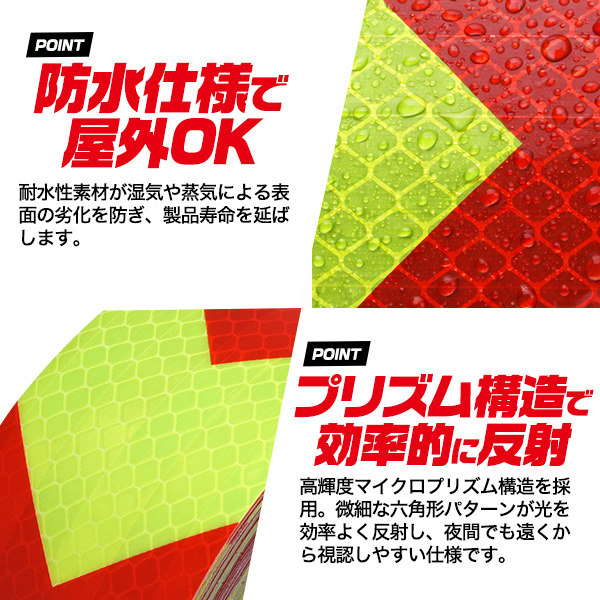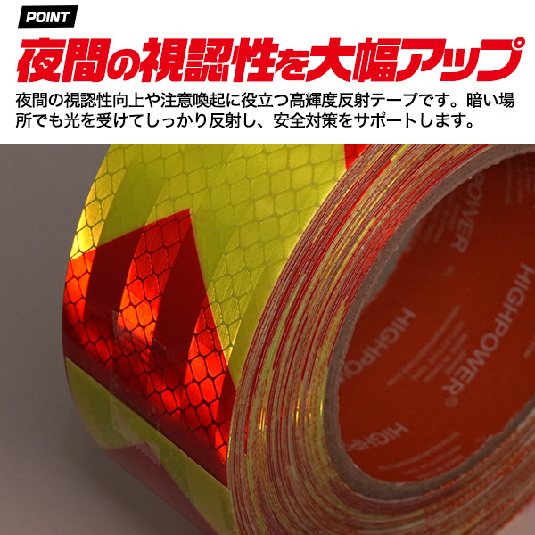 高輝度反射テープ 赤/黄 矢印テープ 長さ18m 幅5cm 夜間の視認性UP 危険箇所表示 ガードテープ 光を反射 視認 安全 テープ 防水仕様 屋外OK 危険表示 施設 店舗 事務所 工場 安全用品 駐車場 ガレージ 資材 虎テープ 衝突防止用 ご自宅 お店 工事現場