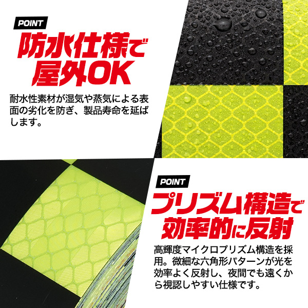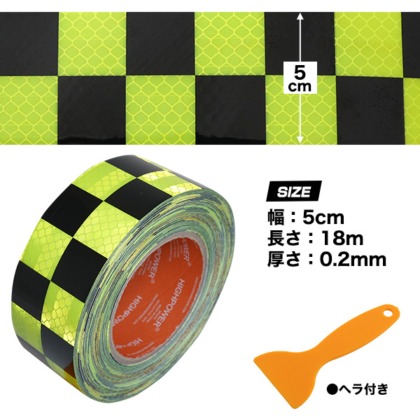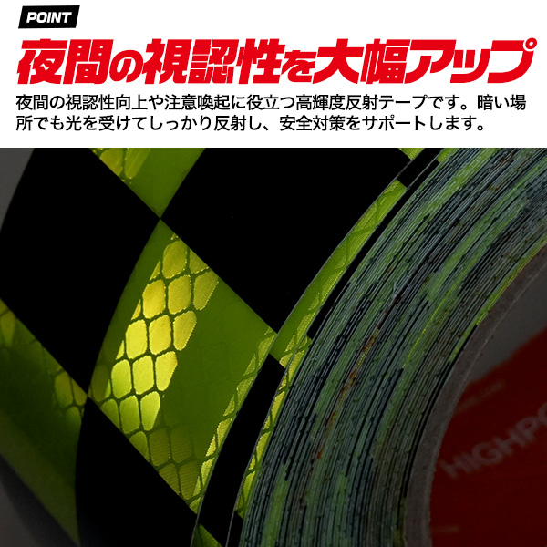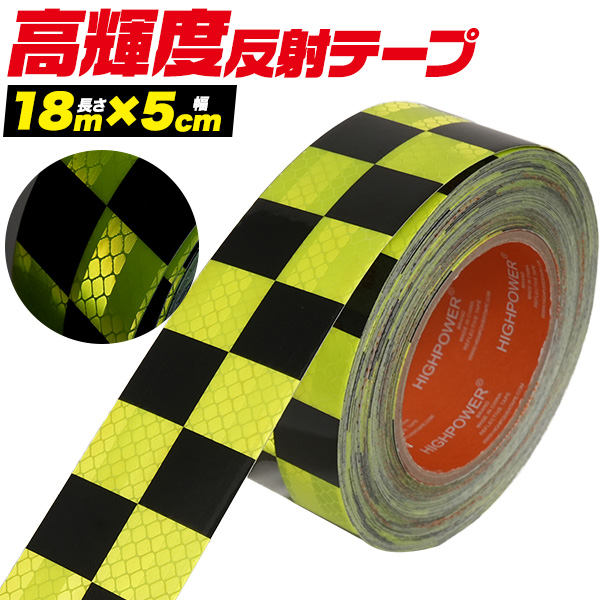 高輝度反射テープ 黄/黒 チェック柄 格子柄 テープ 長さ18m 幅5cm 夜間の視認性UP 危険箇所表示 ガードテープ 光を反射 視認 安全 テープ 防水仕様 屋外OK 危険表示 施設 店舗 事務所 工場 安全用品 駐車場 ガレージ 資材 虎テープ 衝突防止用 ご自宅 お店 工事現場