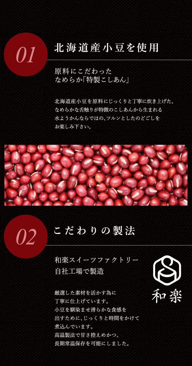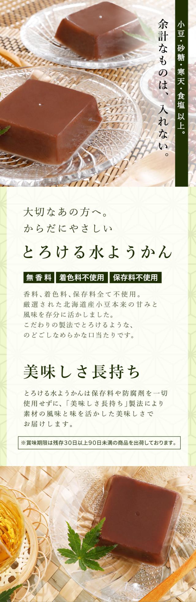 ■余計なものは入れない。大切な方へ、からだにやさしい無添加水ようかん。香料、着色料、保存料全て不使用。厳選された北海道産小豆本来の甘みと風味を存分に活かしました。