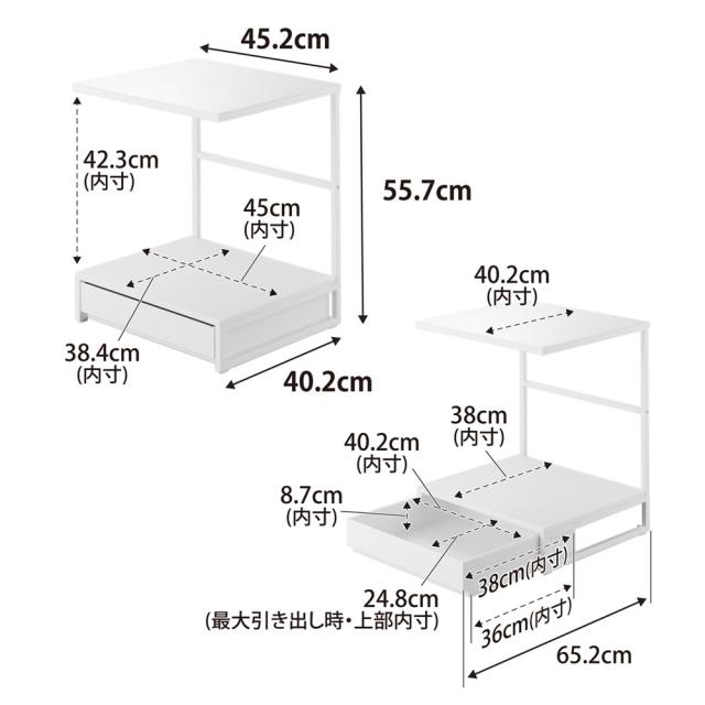 内寸サイズ(約):上棚/幅45.2×奥行40.2cm 置き台/幅45×奥行38.4×高さ42.3cm 引き出し/幅40.2×奥行38×高さ8.7cm(開口部最大幅24.8cm)
