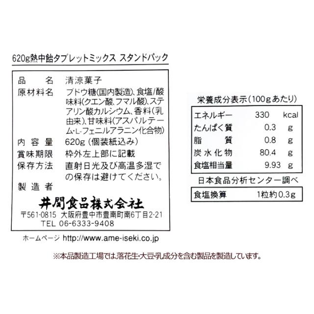 井関食品 【タブ】 熱中飴タブレットミックス スタンドパック 620g (個包装 約100粒) 3種の味 熱中症対策 業務用