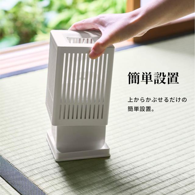上から被せるだけで簡単にセット底蓋の上に蚊取り器を置き、その上から本体を被せるだけでセットが完了します。中身の取り替えも本体を持ち上げるのみで行えます。