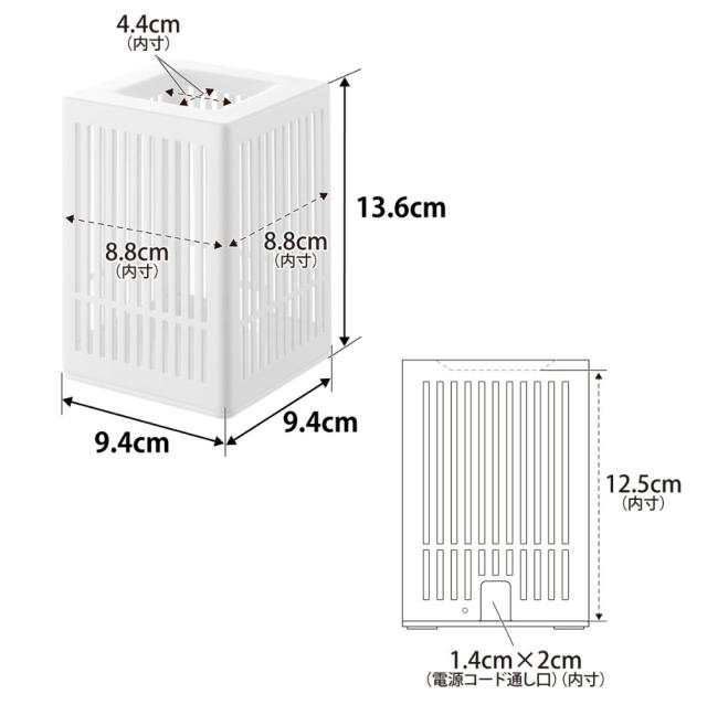 内寸サイズ(約):底蓋収納部/幅8.8×奥行8.8×高さ12.5cm 上面開口部/幅4.4×奥行4.4cm 電源コード通し口/幅1.4×高さ2cm