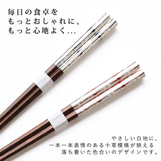 やさしい白地に、一本一本表情のある十草模様が映える、和の趣を感じさせる落ち着いた色合いのお箸です。 毎日口に運ぶものだから、お気に入りの一膳を。 落ち着いた華やかな色合いが、食卓に彩りを添えてくれる、普段使いにぴったりなお箸です。 箸先に滑り止め加工を施しているので、つるつると滑りやすい麺類や豆類もしっかりキャッチ。 毎日の食事がより快適になります。 長さは使いやすい23cm。大人の手にちょうど良く、自然と手に馴染むサイズ感です。 六角形の形状は鉛筆と同じ形。 指先にしっかりフィットして握りやすく、滑りにくい安定感があり、長時間使っても疲れにくいのが特徴です。 また、角があることで転がりにくく、使い勝手にも優れています。 便利&お手入れ簡単な、家庭用食洗機に対応!忙しい毎日に優しい仕様です。 デザイン性と実用性を兼ね備えた、普段使いにぴったりのお箸です。 カラーは、深みのある「紺」とぬくもりを感じる「赤」の2色展開。 ご夫婦やカップルでペアに、来客用に揃えたり、使い方の幅が広がります。 箸は毎日使う物ですのでご贈答にも適しています。 かさばらないのでちょっとしたお返しにもぴったり。 日本文化のお箸は、海外の方へのプレゼント、お土産にも喜ばれます。 |