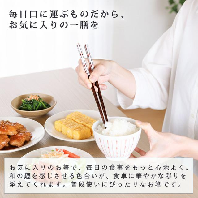 落ち着いた華やかな色合いが、食卓に彩りを添えてくれる、普段使いにぴったりなお箸です。
