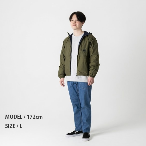 しっかりしていながら軽いナイロン素材は、Tシャツの上から羽織って軽アウターとして、 アウターの中にレイヤーとして、幅広いコーディネートを楽しんでいただけます。 裾にはドローコードがついていて形も決まりやすく防風フィルムが入っているので保温効果も高めてくれます。 リバーシブル仕様でまったく違った印象になるので気分でいろいろ着こなしを楽しめるおススメの商品です。 | ||||||