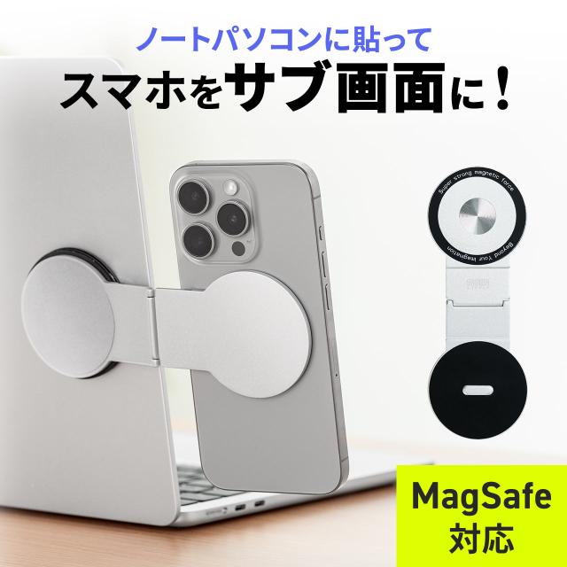 ノートパソコン用スマホホルダー MagSafe対応 スマホスタンド 折りたたみ式 持ち運び 360°回転 無段階角度調整 モニター設置可 iPhone Android メタルリング付属[200-STN098SV]