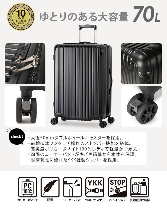 | ゆとりのある大容量キャリー。 抜群の走行安定性・旋回性を誇る大径50mmダブルホイールキャスターが、凹凸のある路面で実力を発揮するうえに、前輪部には簡単に操作可能なストッパー機能を搭載。電車内や坂道などで便利です。 ボディ素材には、新幹線・航空機の窓や防弾ガラスにも採用されている高純度ポリカーボネイトを100%使用し、軽量で頑丈です。 ボディ上部4つの角のコーナーパッドが装備され、キズや衝撃からスーツケースを守ります。 薄型で耐摩耗性に優れたYKK社製ジッパーを使用。ファスナーの破損を防ぎます。 ASIA LUGGAGE / アジアラゲージ 誰にでも、旅立ちという人生をおくるときに必ず通る道があると思います。そしてその時に必ずバック(旅行)を使うと思います。それは、初めての海外旅行であったり、海外留学、新婚旅行、卒業旅行、海外出張、転勤等々さまざまなシーンがあります。A.L.Iブランドは、カバン、トラベルバックに求められたこの役割を使命として位置づけ、人々の大切なシーンをしっかりとサポートさせて頂くことであります。これがA.L.Iブランドに課せられたミッションであり、ブランドコンセプトであります。 |
