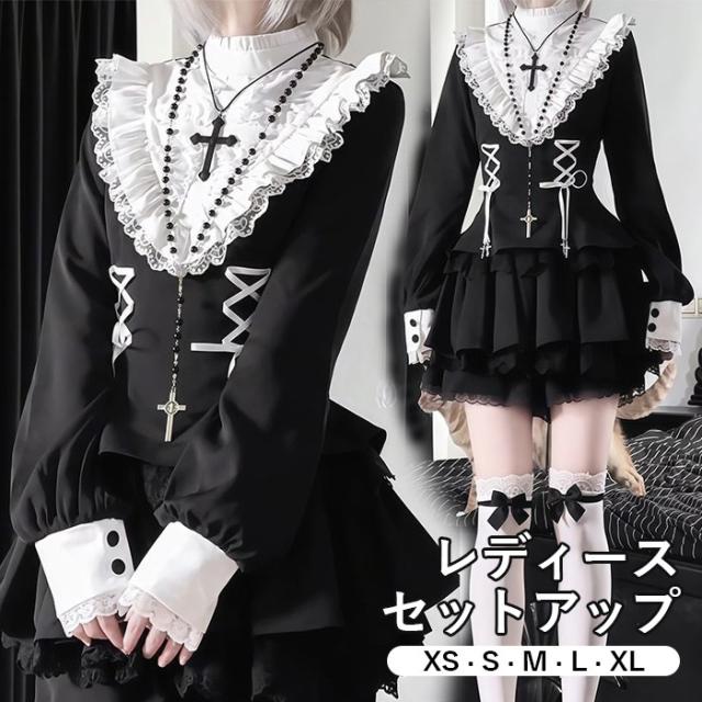 地雷系 ワンピース セットアップ 量産型 レース 2点セット ロリータ シスター風 着痩せ 長袖 レディース 女子 リボン ショート丈 ミニ 蝶結び フリル サブカル系 ギャル ドレス かわいい 病みかわ 暗黒系 学生 お姫様 プリンセス お出かけ ブラック 黒 XS S M L XL