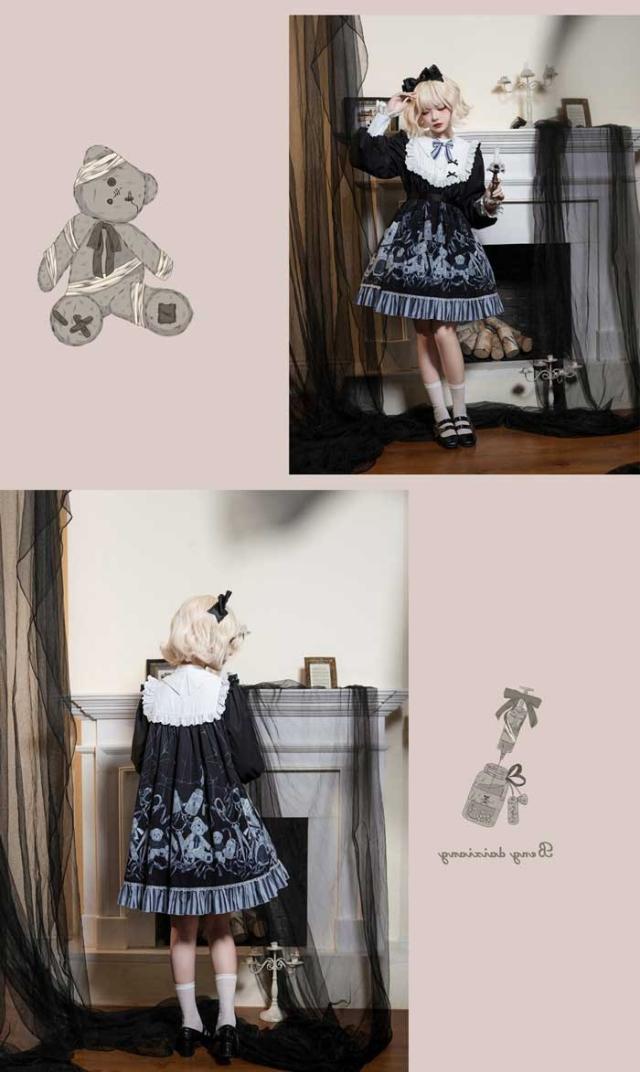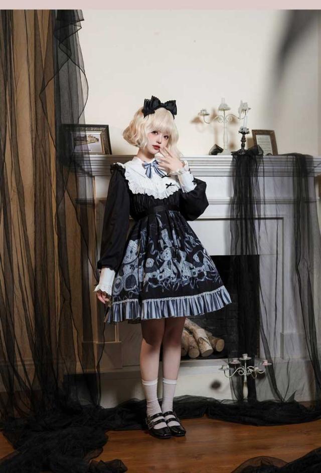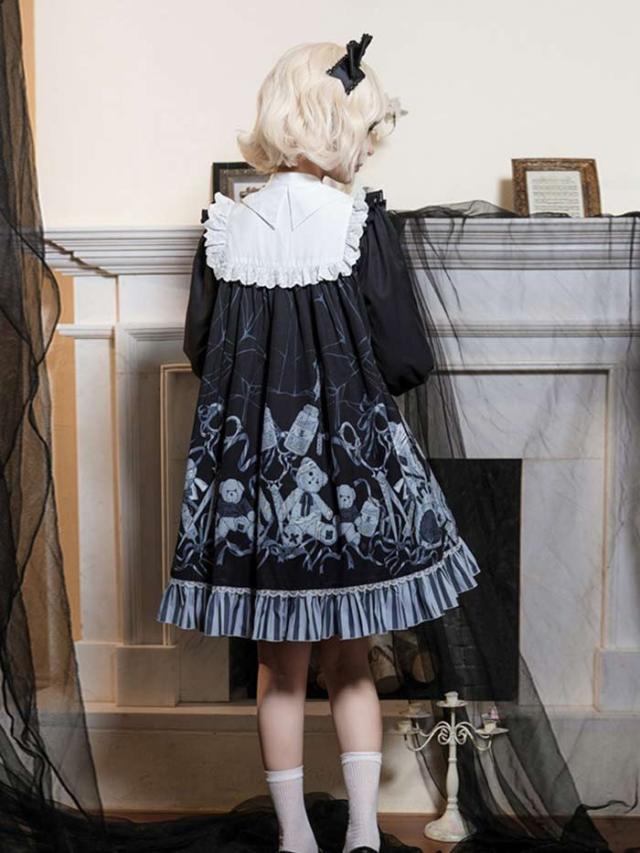 ロリータ ワンピース 大きいサイズ 可愛い お姫様 Lolita ロリータ服 ロリータ リボン 可愛い ゆったり 体型カバー ベルト付き アイドル衣装 コスチューム コスプレ衣装 文化祭 学園祭 かわいい 萌え クマ柄 Aライン イベント ロリータファション ブラック L 2L 3L 4L 5L dn081m3m3x7