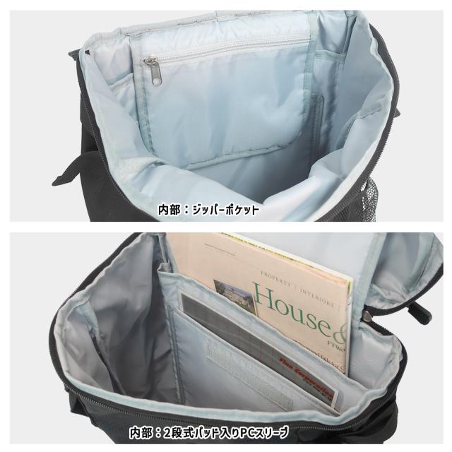 内部にはジッパーポケットに加え、ノートPCやタブレット端末の収納に最適なパッド入りPCスリーブを2段備えています。