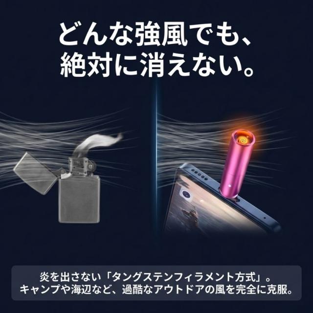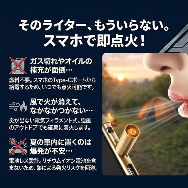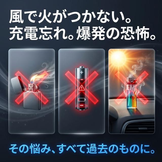 従来の電気ライターにはリチウム電池が内蔵されており、夏場の車内放置や持ち運びの際の発火・爆発リスクが常に付きまといました。しかし、この製品はUSB直接プラグイン点火方式を採用。製品自体に電池を持たないため、熱による危険を根本から回避しています。