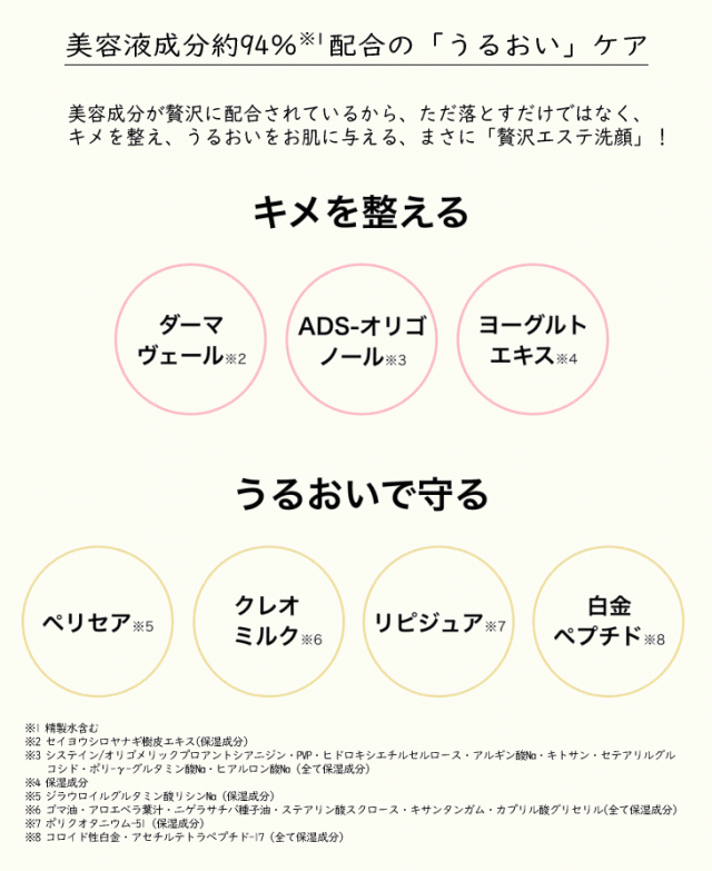 | 配合成分 | 水、グリセリン、(アクリレーツ/アクリル酸アルキル(C10-30))クロスポリマー、BG、グルコマンナン、加水分解コラーゲン、コロイド性白金、アセチルテトラペプチド-17、ポリクオタニウム-51、マンダリンオレンジ果皮エキス、酢酸ヘキサノイルジペプチド-3ノルロイシン、セイヨウシロヤナギ樹皮エキス、ノイバラ果実エキス、ヨーグルト液(牛乳)、ジラウロイルグルタミン酸リシンNa、ゴマ油、アロエベラ葉汁、ニゲラサチバ種子油、ステアリン酸スクロース、キサンタンガム、カプリル酸グリセリル、システイン/オリゴメリックプロアントシアニジン、PVP、ヒドロキシエチルセルロース、アルギン酸Na、キトサン、セテアリルグルコシド、ポリ-γ-グルタミン酸Na、ヒアルロン酸Na、ステアルトリモニウムクロリド、ジココジモニウムクロリド、フェノキシエタノール、イソプロパノール、アクリレーツクロスポリマー、レシチン |