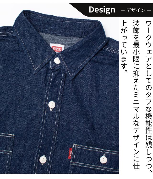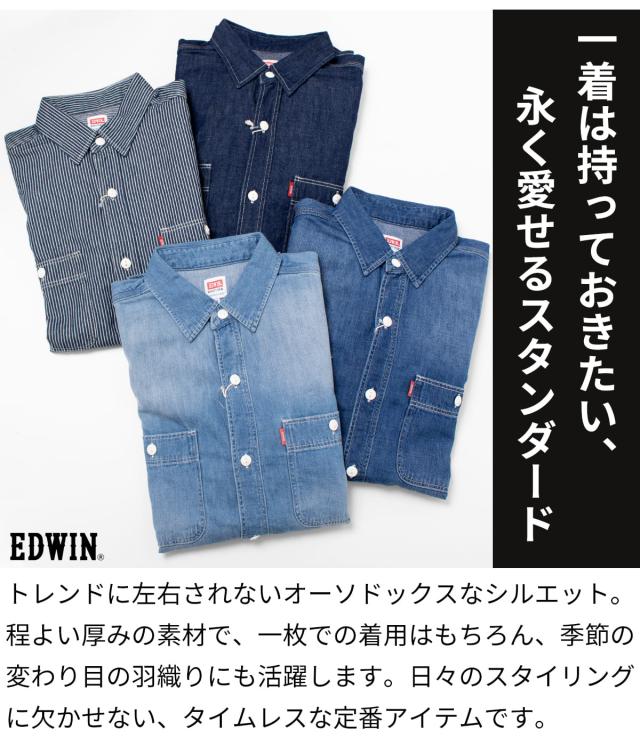 EDWIN デニムシャツ エドウィン デニム ワークシャツ ブランド 長袖 メンズ 長袖シャツ カジュアルシャツ ET2154 シンプル 定番 ベーシック インディゴブルー ワンウォッシュ ヒッコリー 胸ポケット オーソドックス レギュラーサイズ