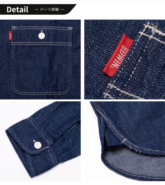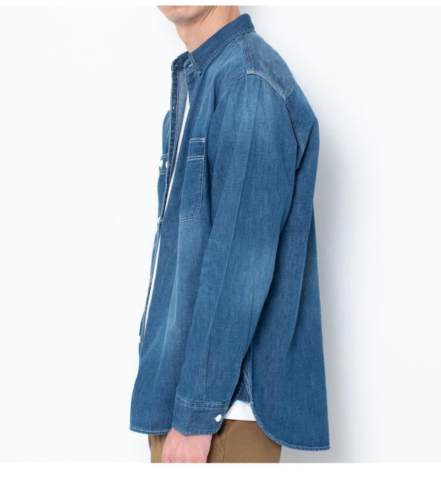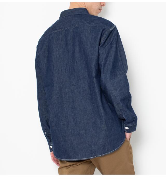 シンプルさを追求した王道のデニムシャツ。程よい厚みの素材で、一枚での着用はもちろん、季節の変わり目の羽織りにも活躍します。日々のスタイリングに欠かせない、タイムレスな定番アイテムです。 〈デザイン〉ワークウェアとしてのタフな機能性は残しつつ、装飾を最小限に抑えたミニマルデザイン。三本針、裾の三角マチ、細かい運針のステッチワークなどヴィンテージの雰囲気を感じられる拘りの仕様を盛り込んだワークシャツです。 〈素材〉ナチュラルな色落ちながら、ムラ糸を使用して立体的な加工感が特徴的なデニム生地を採用。ヒッコリーはピッチを調整し着やすいストライプ幅へ改良。インディゴを使用しているので着込むほど経年変化を感じられる素材です。 |