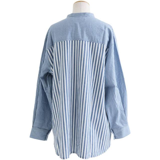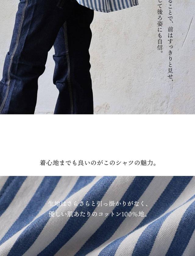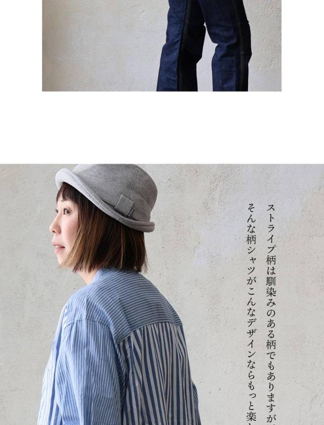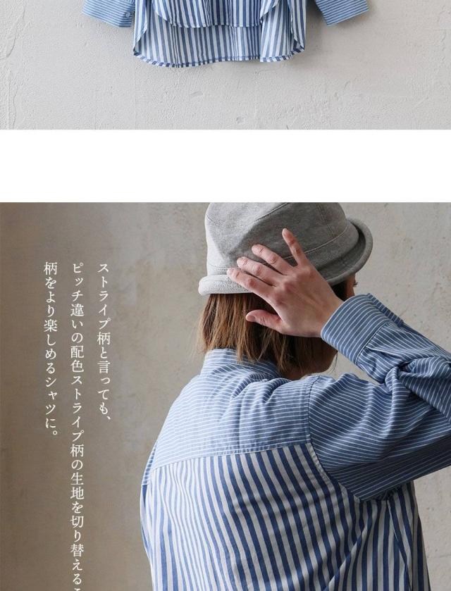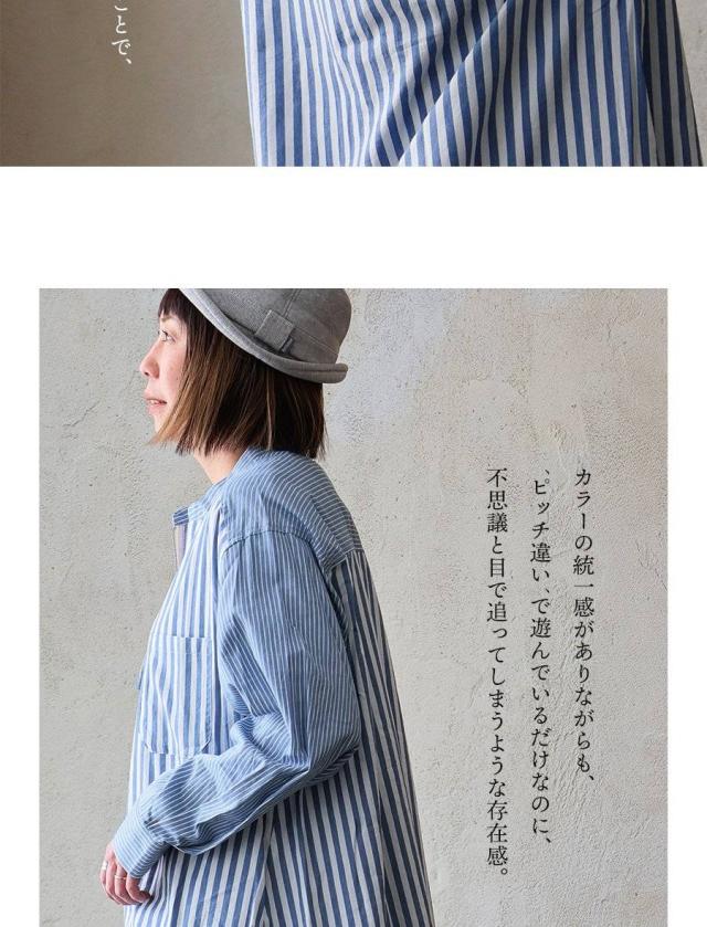 ・ストライプ柄と言っても、ピッチ違いの配色ストライプ柄の生地を切り替えることで、柄をより楽しめるシャツに。