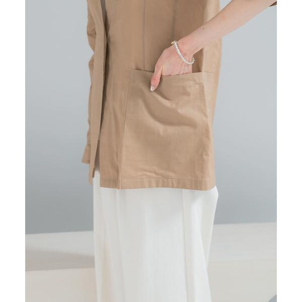 メモリーコットン素材を使用しており、シワになっても手で整えやすく、型崩れしにくいのが魅力。適度なハリ感がありながらも非常に軽量で、春から初夏にかけての軽快な羽織りとして重宝します。ボタンを削ぎ落としたミニマルなVネックデザインが、首まわりをすっきりと知的な印象に見せてくれます。腰回りまでカバーする長めの着丈は、どんなボトムスともバランスが取りやすいよう計算されています。サイドに配置された大きめのパッチポケットが、上品さの中に程よいカジュアル感をプラスしています。きれいめなブラウスに重ねれば、洗練されたオフィススタイルに。休日はTシャツやデニムと合わせて、大人のリラックス感を演出するのも素敵です。袖を軽くまくってニュアンスを出すと、よりこなれたスタイリングを楽しめます。