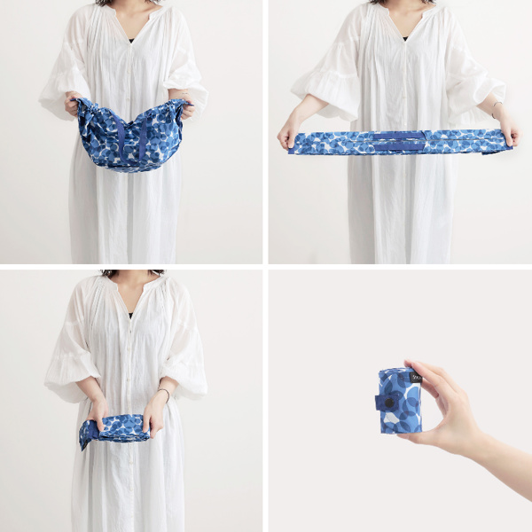 折りたたんで丸めた後も、持ち運びしやすいコンパクトサイズです。ポケットやミニバッグにも入るので、お買い物だけでなくアウトドアや旅行など日常の様々なシーンで活躍します。
