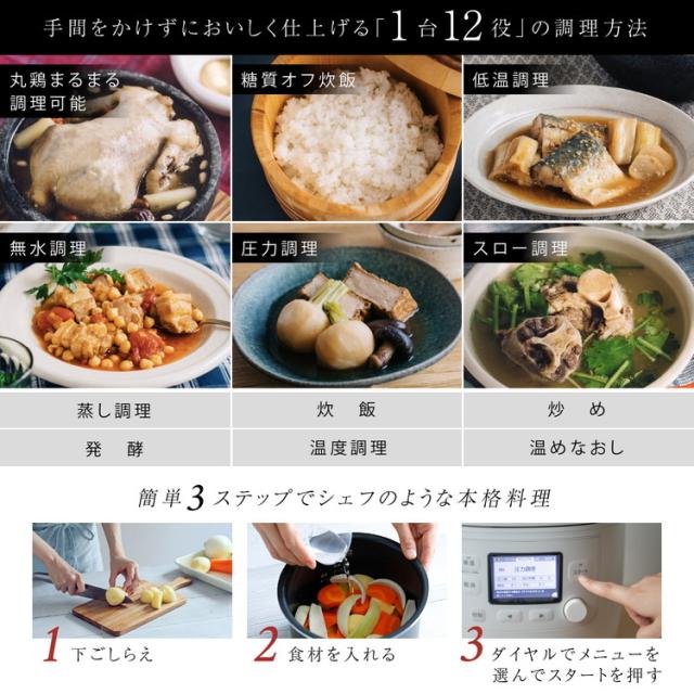 煮込み料理といった圧力調理をはじめ、無水調理、蒸し調理、炊飯、スロー調理、温めなおし、低温調理、炒め(下ごしらえ)、発酵、温度調理が可能。