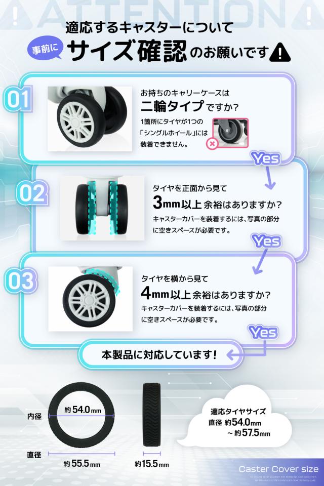 本製品はダブルホイール対応で、直径5.5cm(約54〜57.5mm±1mm)のタイヤに適応するキャスターカバーです。