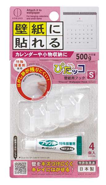 壁紙用フック ぴたッコ S(4×3.1cm) 4個入 特殊接着剤付 (100円ショップ 100円均一 100均一 100均)