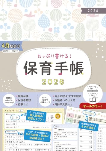 たっぷり書ける!園生活を一元管理するスケジュール&メモ帳 新年度から使える【4月始まり】子どもの記録、行事の計画、会議・懇談のメモ…幼稚園・保育園で必要な情報のすべてをこの1冊に書き込める、機能に優れた保育者専用の手帳。発達一覧、連絡帳にも使える保護者メッセージ、月齢早見表など、あると助かる保育知識も充実! 【目次】 ・年間予定表 ・3年カレンダー ・マンスリーカレンダー ・CONTENTS一覧 ・今月の歌 ・おすすめ絵本 ・保育手帳の使い方 ・名簿ver.1(できたよチェック) ・名簿ver.2(回収物チェック) ・グループメンバー表 ・子どもメモ ・行事メモ ・会議メモ ・方眼メモ ・幼児期の終わりまでに育ってほしい10の姿 ・0〜6歳児の発達一覧 ・行事・日常で使える保護者に伝わるおはなし&言葉かけ ・連絡帳にも使える保護者への伝え方 ・月齢早見表 ・年齢早見表 ・時候の挨拶例 ・登園停止の感染症 ・西暦和暦干支年齢早見表 ・今日は何の日 ・クラス担任・分掌一覧 ・私のプロフィール