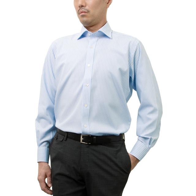 進化した、綿100%形態安定シャツ【日清紡アポロコット】ドレスシャツからデザインにこだわった新ライン【クラシック】が登場!・衿の高さや開きにこだわった独自のワイドスプレッドカラーは、上品なタイドアップスタイルを演出します。・カフス型には大丸を採用し、よりドレッシーな雰囲気に。・胸ポケット無しの正統派スタイルで、スッキリとした見た目に。シャツ1枚でもきまるブルーストライプシャツ。綿100%で柔らかな肌触りです。テープ縫製による縫い代のシワ軽減や、縫製後の特殊な熱処理で驚異の形状記憶性を実現。ご家庭で洗濯されてもシワが気にならないので、お手入れが簡単で家事の手間が削減されます。