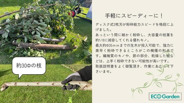 最大約Φ35mmまでの生木が投入可能で、強力に素早く粉砕できるところがこの機種の利点です。