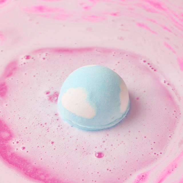 白い雲が浮かぶ青空から静かな夕暮れ空へ、待ち焦がれた夏の日をバスアートが描きます。甘いリンゴのような香りがするバスボム(入浴料)は、元気な気分になりたい時に。