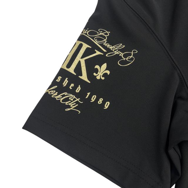 フロント胸元とバックにゴールドローズのラメプリントが大胆に配置された半袖ポロシャツ
