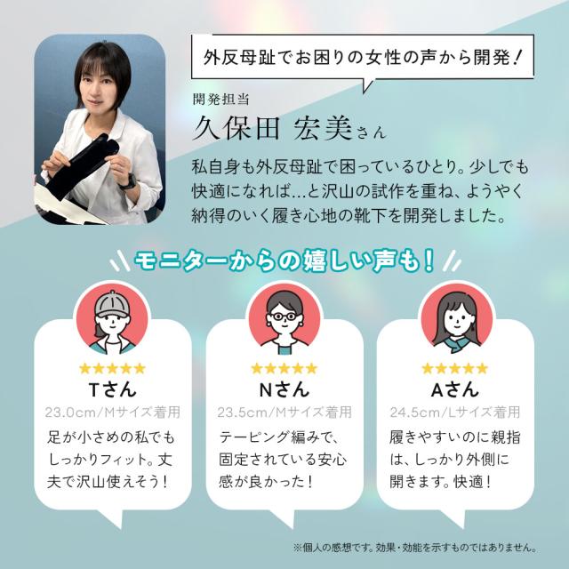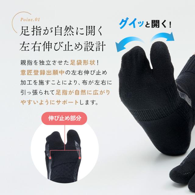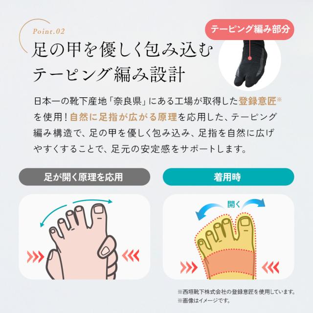 左右の伸び止め加工とテーピング編みで足指を自然に広げます。