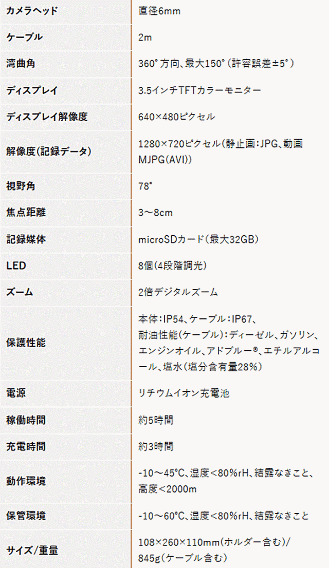 ■ 直径6mm、長さ2m、IP67の防水+耐油性能のカメラ