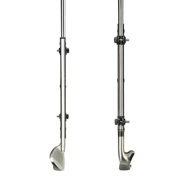 ●白いラインをリーディングエッジに合わせて自身のクラブに装着。フェースの向きが視認しやすくなります。白いラインでボールをとらえるイメージでアドレスします。※装着した状態で実際にボールが打てます。