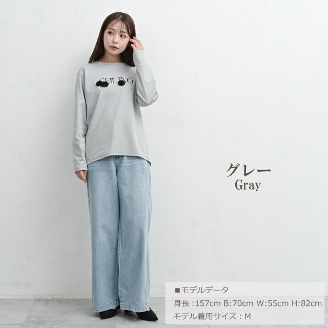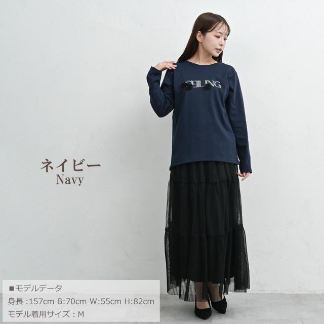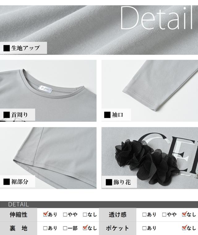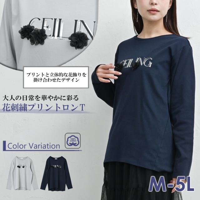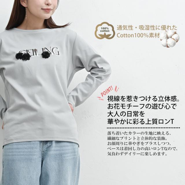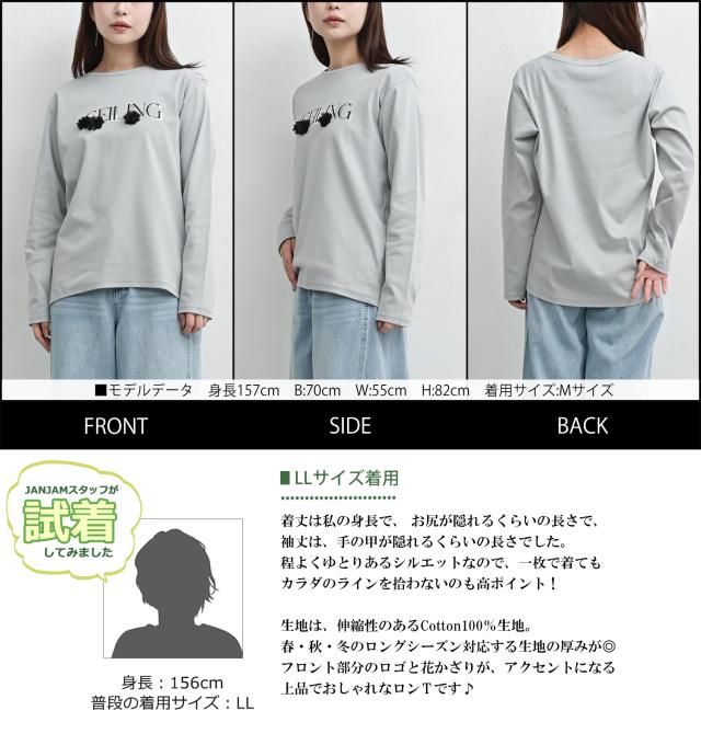 cdo-saw-tp0696【JANJAM2026春新作】長袖トップス 長袖カットソー 長袖Tシャツ コットンカットソー コットンTシャツ ロングTシャツ ロンT ロゴT 花刺繍プリント 立体花飾り プチコサージュ風 花 フラワー ロゴプリント クルーネック 長袖 10分袖 十分袖 ロングスリーブ バックテール 春服 秋服 冬服 春物 秋物 冬物 春用 秋用 冬用 春夏 春秋 春トップス 秋トップス 冬トップス ロングシーズン対応 綿100% コットン100% cotton100 裏地なし 伸びる生地 伸縮性 ストレッチ お尻が隠れる着丈 お尻すっぽり丈 長め着丈 チュニック丈 ゆったり 大きめ 体型カバー 着痩せ 華奢見え 大人カジュアル きれいめカジュアル 大人 カジュアル フェミニン ナチュラル 大人可愛い 快適 上品 きれいめ 綺麗め かわいい 可愛い かっこいい 着こなし おしゃれ JANJAM ジャンジャン ジャンジャム 定番 春コーデ 秋コーデ 冬コーデ ファッション ぽっちゃり プラスサイズ ゆったりサイズ 女性 婦人用 婦人 women ミセス ママ 30代 40代 50代 2026 春新作 春 秋 冬 灰色 紺 グレー ネイビー LL 3L 4L 5L 2L XL XXL XXXL XXXXL 2XL 3XL 4XL 13号 15号 17号 19号