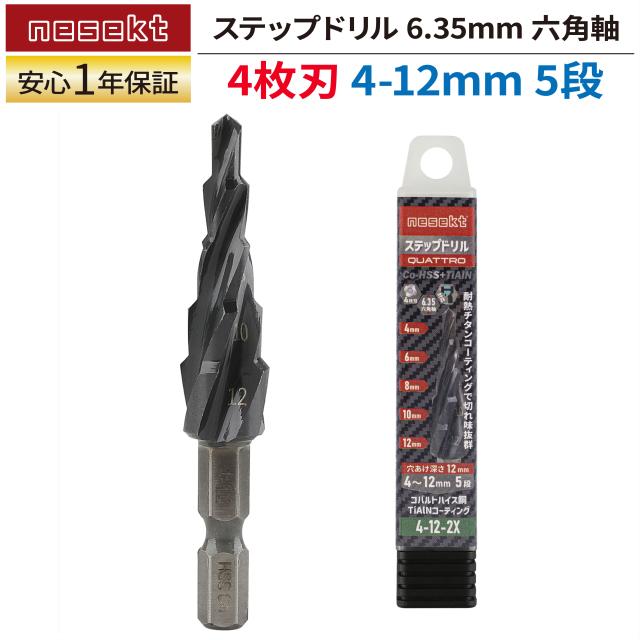 [ネセクト] ステップドリル 6.35mm六角軸 チタンコーティング インパクト対応[日本国内企画品] (4枚刃 4-12mm 5段) [日本国内企画品 1年保証]
