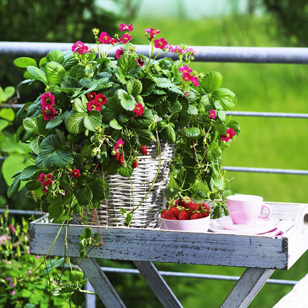濃いピンクの花と、甘くて美味しい赤いいちごとのコンビネーションを