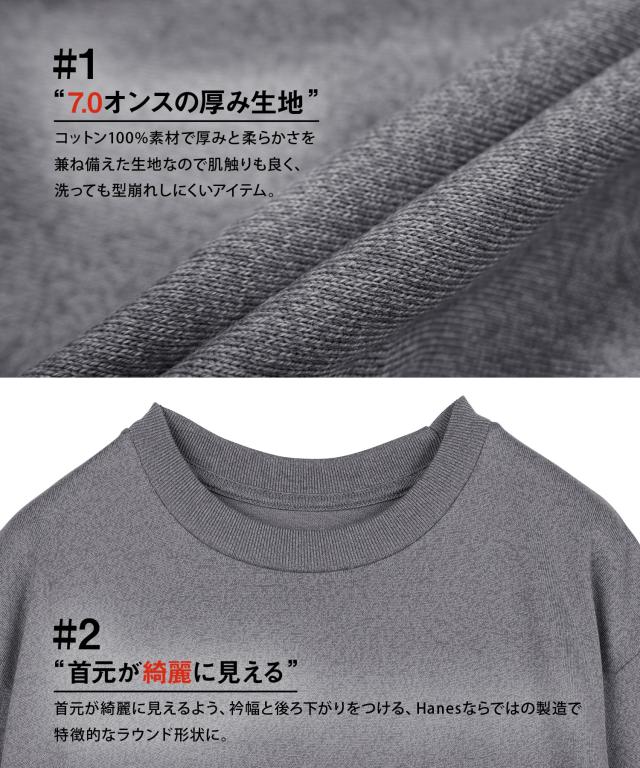汗染みを克服した究極の「杢グレー」。Hanes(ヘインズ)のクルーネック半袖Tシャツ。7.0オンスの肉厚ボディは、綿100%の快適さを保ちつつ、独自の技術で夏場の汗問題を解決。丸胴仕様とタグレス仕様で着心地にも妥協なし。Tシャツに求める全てを詰め込んだ、新時代のマスターピース。プレゼントにもおすすめです◎