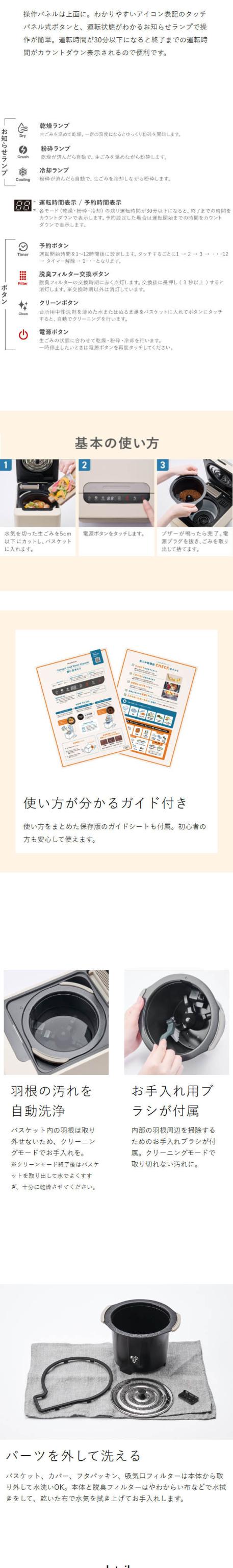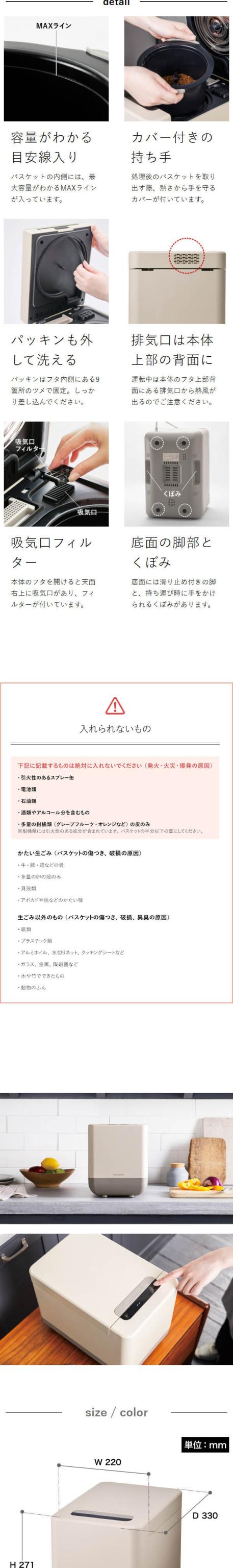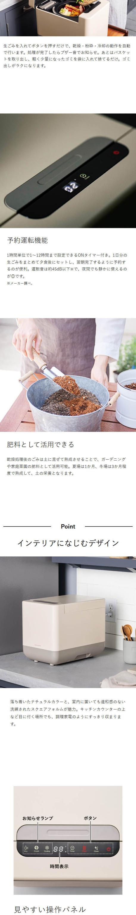 小型で使いやすい生ごみ処理機。最大容量は1.5Lで生ごみを自動で乾燥・粉砕・冷却し約1/10の重さに減らせるパワフルな乾燥式。パワーアップした脱臭フィルター付きで予約運転も可能です。
