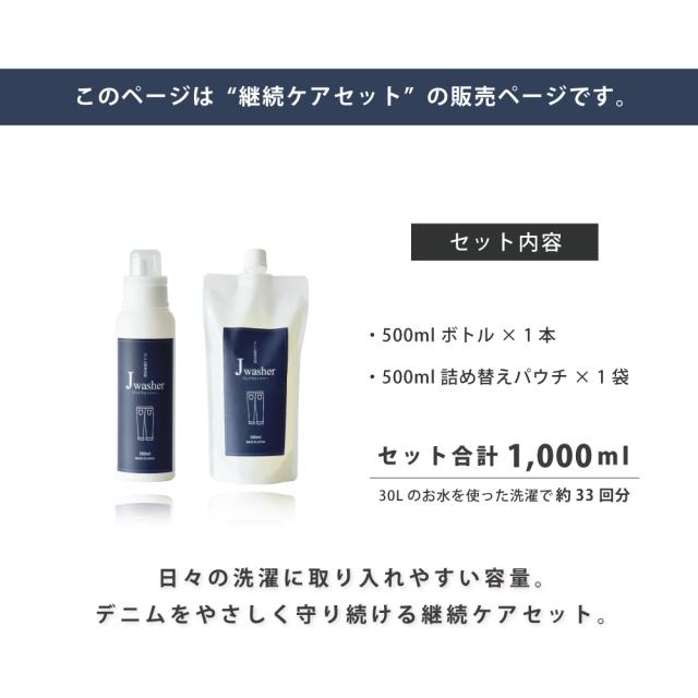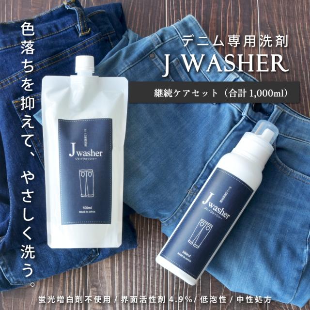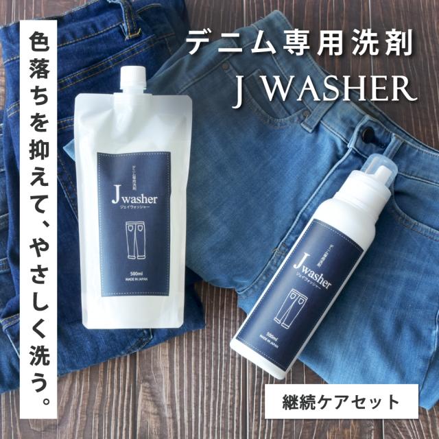 デニム用洗剤 J-Washer 500ml 継続ケアセット (ボトル+詰め替え) | デニム専用洗剤 おしゃれ着洗い デニム ジーンズ 洗剤 色物洗い 漬け置き 色落ち防止 無着色 無香料 無添加 蛍光増白剤フリー 液体洗剤 衣類洗剤 衣類用洗剤 洗濯用洗剤 中性洗剤 ジェイウォッシャー
