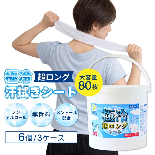 汗拭きシート 極冷 超ロングシート 6個 冷感タオル 熱中症対策 使い捨て 大容量 80枚入り 大判 無香料 ノンアルコール パウダー配合 メントール配合 PEACEUP