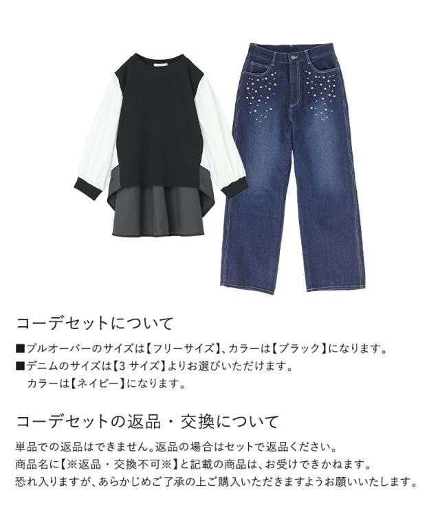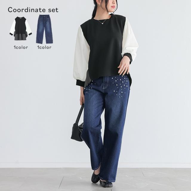 『ベスト風シャツ配色プルオーバー×フェイクパール付きストレートデニムコーデ2点SET』【メール便不可】【40】[2点コーデセット 2026 レディース プルオーバー トップス 長袖 デニム ボトムス パンツ ジーンズ]