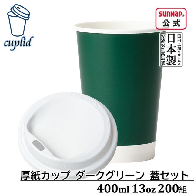 cuplid 厚紙カップ タ゛ークク゛リーン 400ml 13oz 蓋白セット 200組【 紙コップ 蓋付き 蓋セット テイクアウト Lサイズ 】