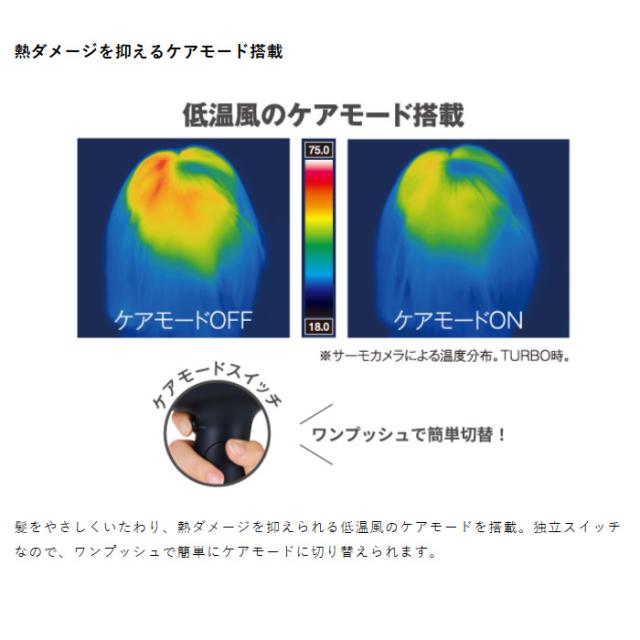 ●髪をやさしくいたわり、熱ダメージを抑えられる低温風のケアモードを搭載。独立スイッチなので、ワンプッシュで簡単にケアモードに切り替えられます。
