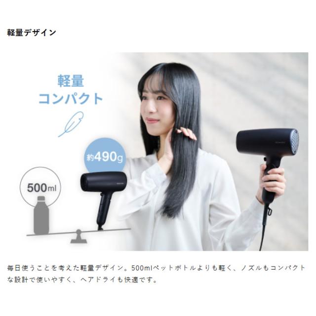 忙しい毎日でも、大風量速乾と髪へのやさしさを両立。 大風量2.0m3/分(※)とスピードアップノズル内蔵で、髪を根元から素早く乾かせます。 プロテクトイオンとケアモード搭載で、ヘアドライしながら髪をいたわり、ツヤとまとまりのある髪へ導きます。 ※TURBO使用時 JIS規格測定法による ■電源:AC100V 50Hz/60Hz ■消費電力:1300W ■風量(m3/分):2.0m3/分(JIS規格 TURBO使用時) ■温風温度:95℃(周辺温度30℃の場合 SET使用時) ■搭載イオン:プロテクトイオン ■スイッチ:切替スイッチ:TURBO/SET/COOL/OFF、ケアモードスイッチ:ON/OFF ■外形寸法:幅約172mm×奥行約78mm×高さ約216mm(本体のみ) ■質量:約490g (本体のみ) ■主材料:PC、ABS ■コード長:1.7m ■ラク抜きプラグ:○ ■折りたたみ:○ ※記載は商品仕様の一部です。仕様説明不足等の理由での返品はできません。特に適合等は必ずご確認ください。