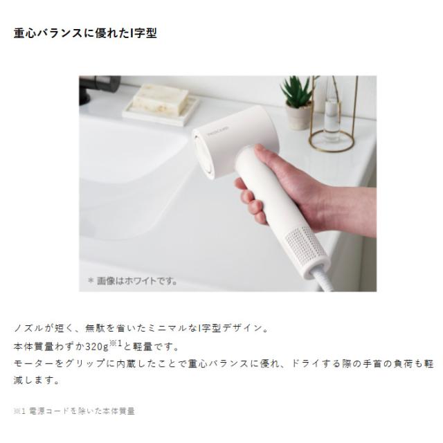 ●ノズルを短くし無駄を省いたI字型のボディで、本体を約320gまで軽量化。モーターをグリップに内蔵したことで重心バランスに優れた形状を実現。ドライヤーを振る際の手首の負荷を軽減します。 ※電源コードを除いた本体質量