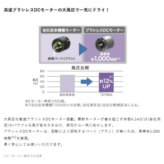 ●大風圧の高速ブラシレスDCモーター搭載。最新モーターが巻き起こす体感4.1m3/分(自社測定)のパワフルな風が髪をかき分け、根元から一気に乾かします。