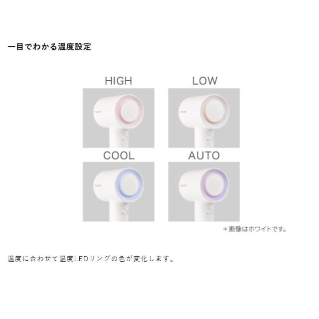 ●選べる4つのモード搭載。AUTOモードが熱ダメージを抑制し、髪を優しく乾かす。HIGH/LOW/COOL/AUTOの4つのモードから好みの温度を選べます。温度に合わせて温度LEDリングの色が変化します。