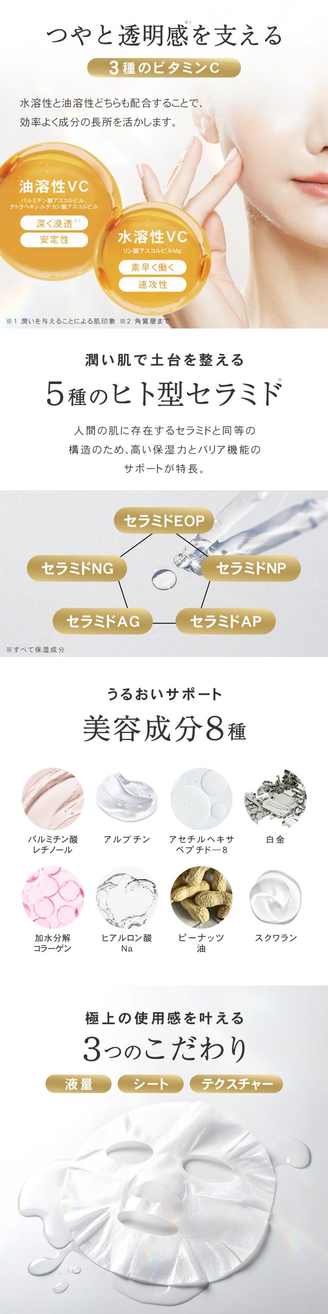 水、BG、DPG、グリセリン、ナイアシンアミド、アセチルヘキサペプチド—8、水添レシチン、フィトステロールズ、セラミドEOP、セラミドNG、セラミドNP、セラミドAG、セラミドAP、リン酸アスコルビルMg、グルタチオン、パルミチン酸アスコルビル、アルブチン、レシチン、アマニ脂肪酸、酢酸トコフェロール、白金、加水分解コラーゲン、ヒアルロン酸Na、炭酸水素Na、セルロースガム、ソルビトール、テトラヘキシルデカン酸アスコルビル、トコフェロール、パンテノール、パルミチン酸レチノール、ピーナッツ油、スクワラン、カプリリルグリコ−ル、カルボマー、キサンタンガム、PEG-60水添ヒマシ油、ペンチレングリコール、エチルヘキシルグリセリン、クエン酸、クエン酸Na、フェノキシエタノール