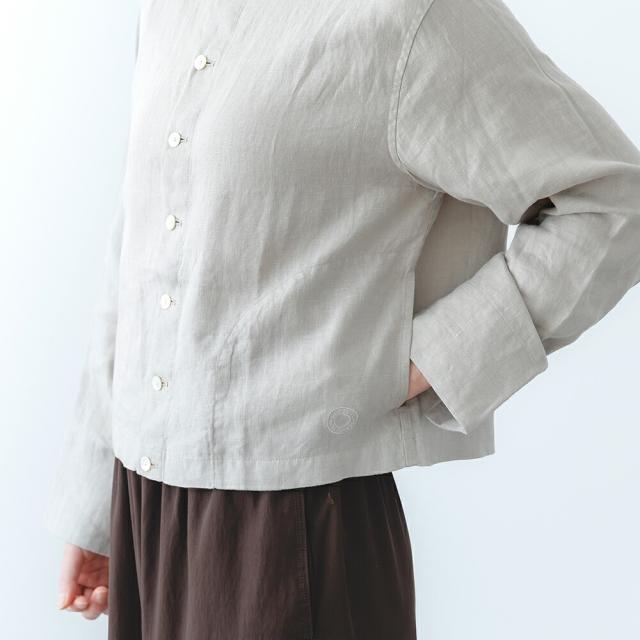 襟をなくしたノーカラーの首元が、顔まわりをすっきりと見せ、小粒のようなフロントボタンが上品なニュアンスをプラスします。