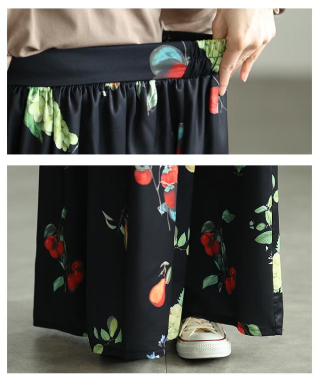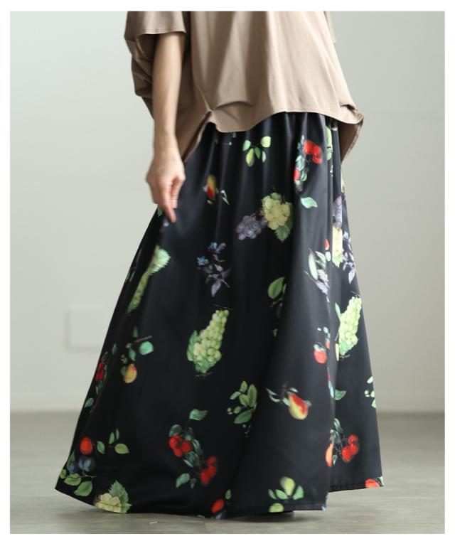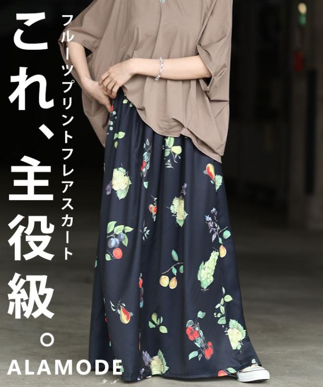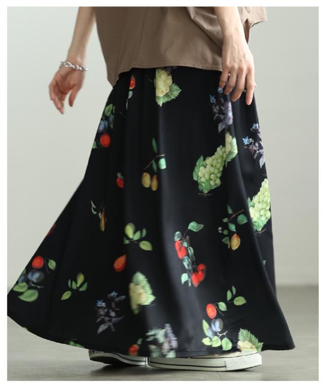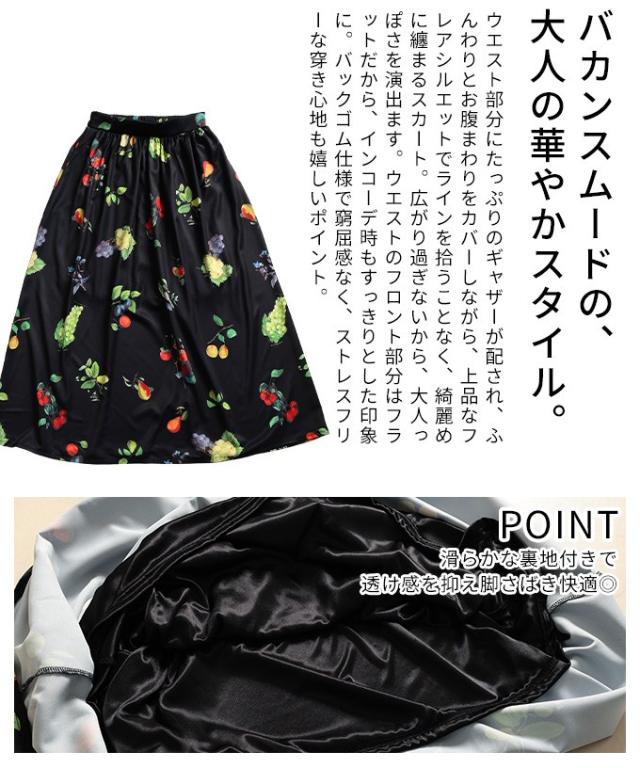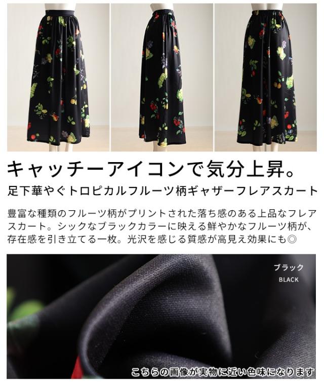 春新作 足下華やぐトロピカルフルーツ柄ギャザーフレアスカート レディース ファッション スカート フルーツ 総柄 ギャザー フレア ウエストゴム ロング 裏地 30代 40代 50代 60代 アラモード alamode otona 大人 cawaii 可愛い 洋服 かわいい服 aldt-844a3583